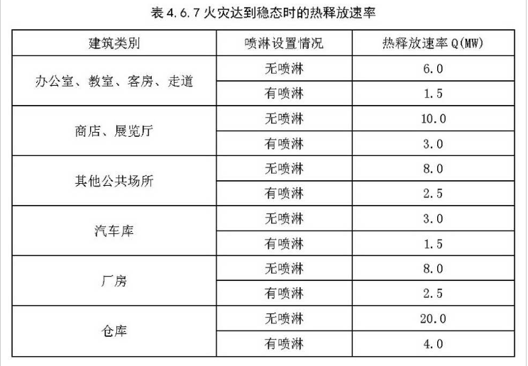 4.6.7 火灾烟气的聚集主要是由火灾热释放速率、火源类型、空间大小形状、环境温度等因素决定的。本条参照了国外的有关实验数据,规定了建筑场所火灾热释放速率的确定方法和常用数据。当房间设有有效的自动喷水灭火系统(简称喷淋)时,火灾时该系统自动启动,会限制火灾的热释放速率。根据现行国家标准《自动喷水灭火系统设计规范》GB