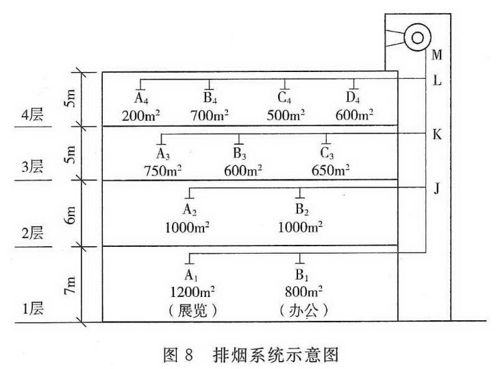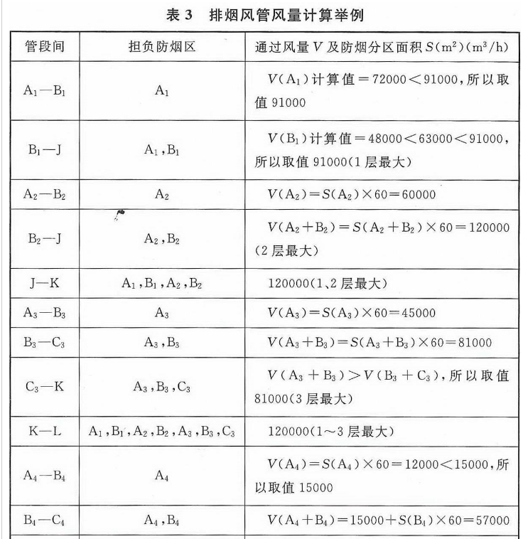 当一个排烟系统担负多个防烟分区排烟时,系统排烟量可参照图8和表3的计算示例进行计算,但为了确保系统可靠性,一个排烟系统担负防烟分区的个数不宜过多。
