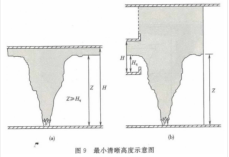 火灾时的最小清晰高度是为了保证室内人员安全疏散和方便消防人员的扑救而提出的最低要求,也是排烟系统设计时必须达到的最低要求。对于单个楼层空间的清晰高度,可以参照图9(a)所示,式(4.6.9)也是针对这种情况提出的。对于多个楼层组成的高大空间,最小清晰高度同样也是针对某一个单层空间提出的,往往也是连通空间中同一防烟分区中最上层计算得到的最小清晰高度,如图9(b)所示。然而,在这种情况下的燃料面到烟层底部的高度Z是从着火的那一层起算,见图9(b)所示。