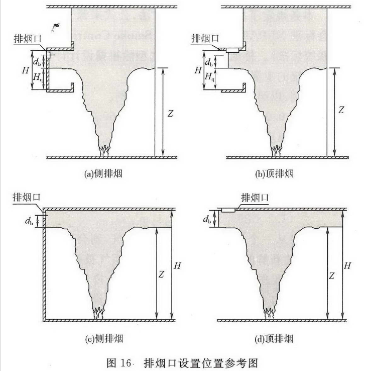 如果从一个排烟口排出太多的烟气,则会在烟层底部撕开一个“洞”,使新鲜的冷空气卷吸进去,随烟气被排出,从而降低了实际排烟量,见图15,因此本条规定了每个排烟口的最高临界排烟量,公式选自NFPA92。其中排烟口的当量直径为4倍排烟口有效截面积与截面周长之比。排烟口设置位置参考图见图16。例如,矩形排烟口的当量直径[宽高为a,b]可用式(2)计算: