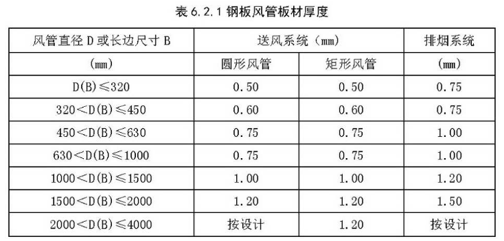 风管板材的厚度以满足系统的功能需要为前提的,本条从保证风管质量的角度出发,对常用的钢板风管的最低厚度进行了规定;在一些场所需要采用特殊要求的风管,则应根据设计的要求选择达到相应耐火极限。风管的材质、厚度、耐火性能等应与国家市场准入要求的文件内容一致。