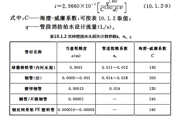 10.1.2 消防给水管道单位长度管道沿程水头损失应根据管材、水力条件等因素选择,可按下列公式计算: