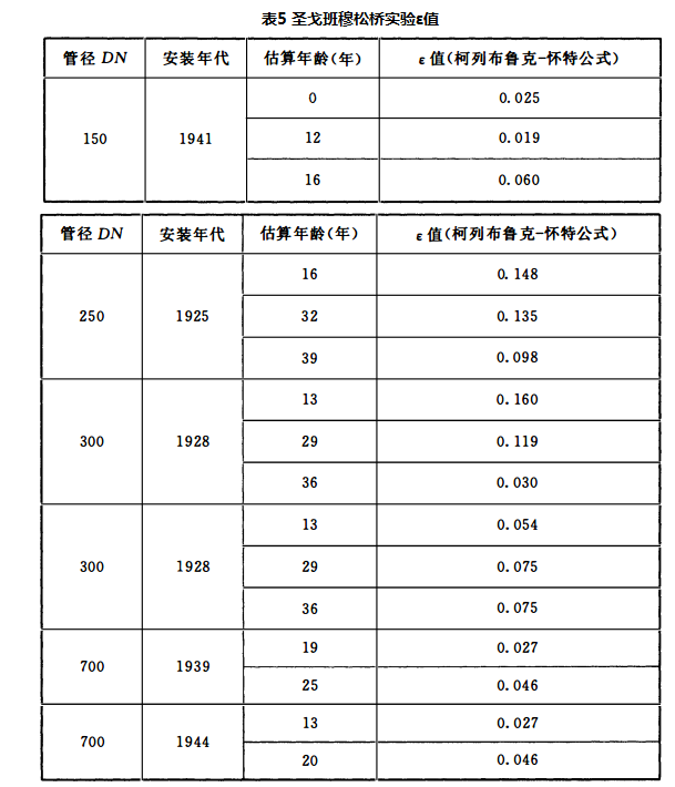 在水力计算时,其他的参数很容易就可以确定,管道粗糙度k的取值尤为关键。球墨铸铁管采用旋转喷涂的工艺,得到一个光滑的、均匀的水泥砂浆内衬。圣戈班穆松桥进行了一系列的试验,已经得出了内衬的粗糙度k值。其平均值为0.03mm,当和绝对光滑的管道ε=0比较时(计算流速为1m/s),对应的额外水头损失为5%~7%。不管怎样,管道的相关表面粗糙度不仅依赖于管道表面的均匀性,而且特别依赖于弯头、三通和其他连接形式的数量,如管线纵剖面的不规则性。经验显示ε=0.1对于配水管线来说是一个合理的数值。对于每千米只有几个管件的长距离的管线来说,ε的取值可以稍微地降低(可取系数0.6~0.8)。当然,ε的取值还应当包括其他因素的影响,如水质的不同等。圣戈班穆松桥进行ε值试验时的部分管道数据见表5。