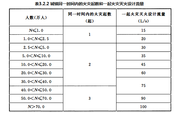 城镇市政消防给水设计流量,应按同一时间内的火灾起数和一起火灾灭火设计流量经计算确定。同一时间内的火灾起数和一起火灾灭火设计流量不应小于表3.2.2的规定。