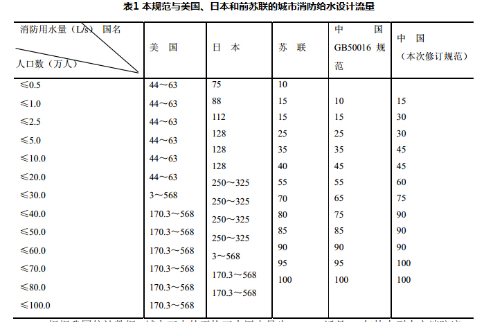 美国、日本和前苏联均按城市人口数的增加而相应增加消防用水量。例如,在美国,人口不超过20万的城市消防用水量为44L/s~63L/s,人口超过30万的城市消防用水量为170.3L/s~568L/s;日本也基本如此。本规范根据火场用水量是以水枪数量递增的规律,以2支水枪的消防用水量(即15L/s)作为下限值,以100L/s作为消防用水量的上限值,确定了城镇消防用水量。本规范与美国、日本和前苏联的城镇消防用水量比较,见表1。