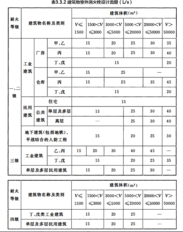 建筑物室外消火栓设计流量不应小于表3.3.2的规定。