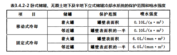 甲、乙、丙类可燃液体地上立式储罐冷却水系统保护范围和喷水强度不应小于本规范表3.4.2-1的规定;卧式储罐、无覆土地下及半地下立式储罐冷却水系统保护范围和喷水强度不应小于本规范表3.4.2-2的规定;室外消火栓设计流量应按本规范第3.4.2条第3款的规定确定。