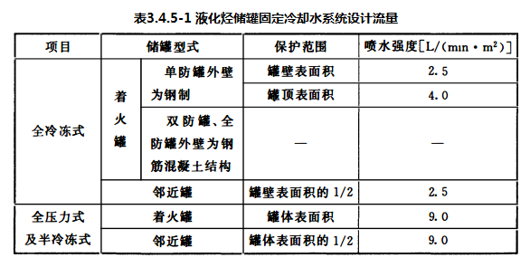 3.4.7 全压力式、半冷冻式和全冷冻式液氨储罐的消防给水设计流量,应按本规范第3.4.5条中全压力式及半冷冻式储罐的要求经计算确定,但喷水强度应按不小于6.0L/(min·m2)计算,全冷冻式液氨储罐的冷却水系统设计流量应按全冷冻式液化烃储罐外壁为钢制单防罐的要求计算。