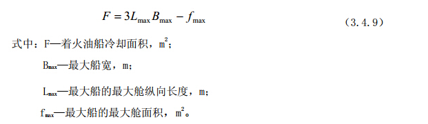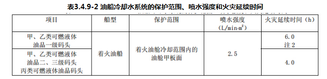油船冷却水系统设计流量应按火灾时着火油舱冷却水保护范围内的油舱甲板面冷却用水量计算确定,冷却水系统保护范围、喷水强度和火灾延续时间不应小于表3.4.9-2