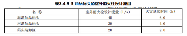 5 油品码头的室外消火栓设计流量不应小于表3.4.9-3的规定。