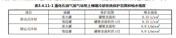 注:1 固定冷却水系统当采用水喷雾系统冷却时喷水强度应符合本规范要求,且系统设置应符合现行国家标准《水喷雾灭火系统设计规范》GB