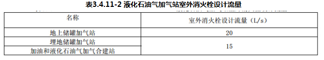 3.4.11 液化石油气加气站的消防给水设计流量,应按固定冷却水系统设计流量与室外消火栓设计流量之和确定,固定冷却水系统设计流量应按表3.4.11-1规定的设计参数经计算确定,室外消火栓设计流量不应小于表3.4.11-2的规定;当仅采用移动式冷却系统时,室外消火栓的设计流量应按表3.4.11-1规定的设计参数计算,且不应小于15L/s。