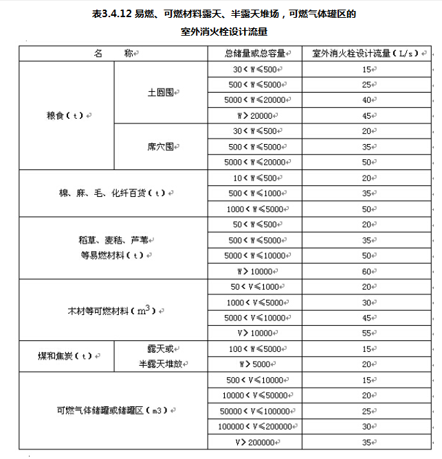 易燃、可燃材料露天、半露天堆场,可燃气体罐区的室外消火栓设计流量,不应小于表3.4.12的规定。