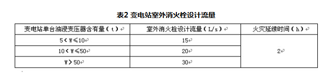 50016的等级划分,考虑我国工程实践和实际情况确定了变压器的室外消火栓设计流量,见表2。现行国家标准《火力发电厂与变电站设计防火规范》GB