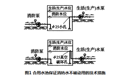 4.3.8 本条为强制条文,必须严格执行。消防用水与生产、生活用水合并时,为防止消防用水被生产、生活用水所占用,因此要求有可靠的技术设施(例如生产、生活用水的出水管设在消防水面之上)保证消防用水不作他用。参见图1。