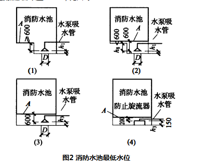 消防水池(箱)的有效水深是设计最高水位至消防水池(箱)最低有效水位之间的距离。消防水池(箱)最低有效水位是消防水泵吸水喇叭口或出水管喇叭口以上0.6m水位,当消防水泵吸水管或消防水箱出水管上设置防止旋流器时,最低有效水位为防止旋流器顶部以上0.20m,见图2。