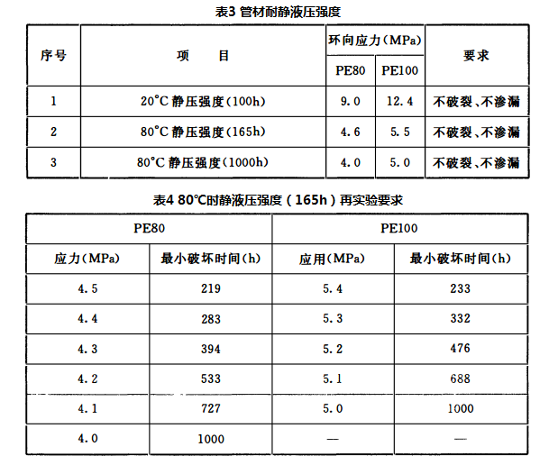 静液压强度:应符合表3和表4的规定。80℃静液压强度165h,试验只考虑脆性破坏;在要求的时间(165h)内发生韧性破坏时,则应按表4选择较低的破坏应力和相应的最小破坏时间重新试验。