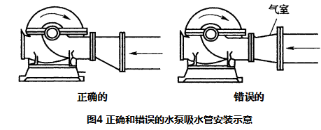 消防水泵吸水管安装若有倒坡现象则会产生气囊,采用大小头与消防水泵吸水口连接,如果是同心大小头,则在吸水管上部有倒坡现象存在。异径管的大小头上部会存留从水中析出的气体,因此应采用偏心异径管,且要求吸水管的上部保持平接见图4;