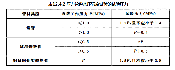12.4.3 水压强度试验的测试点应设在系统管网的最低点。对管网注水时,应将管网内的空气排净,并应缓慢升压,达到试验压力后,稳压30min后,管网应无泄漏、无变形,且压力降不应大于