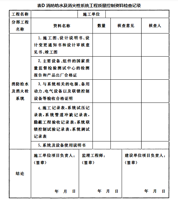 消防给水及消火栓系统工程质量控制资料检查记录
