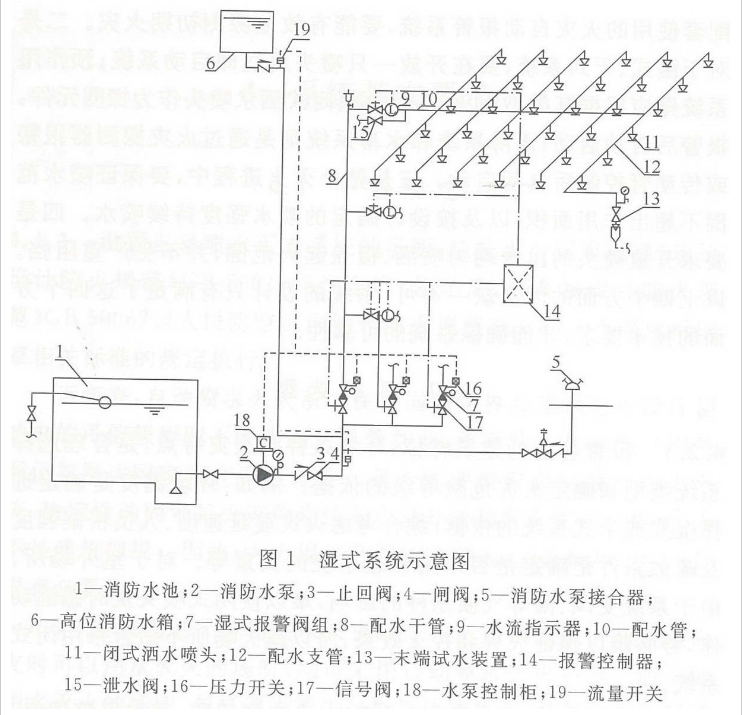 湿式系统(图1)由闭式喷头、水流指示器、湿式报警阀组,以及管道和供水设施等组成,准工作状态时管道内始终充满水并保持一定压力。