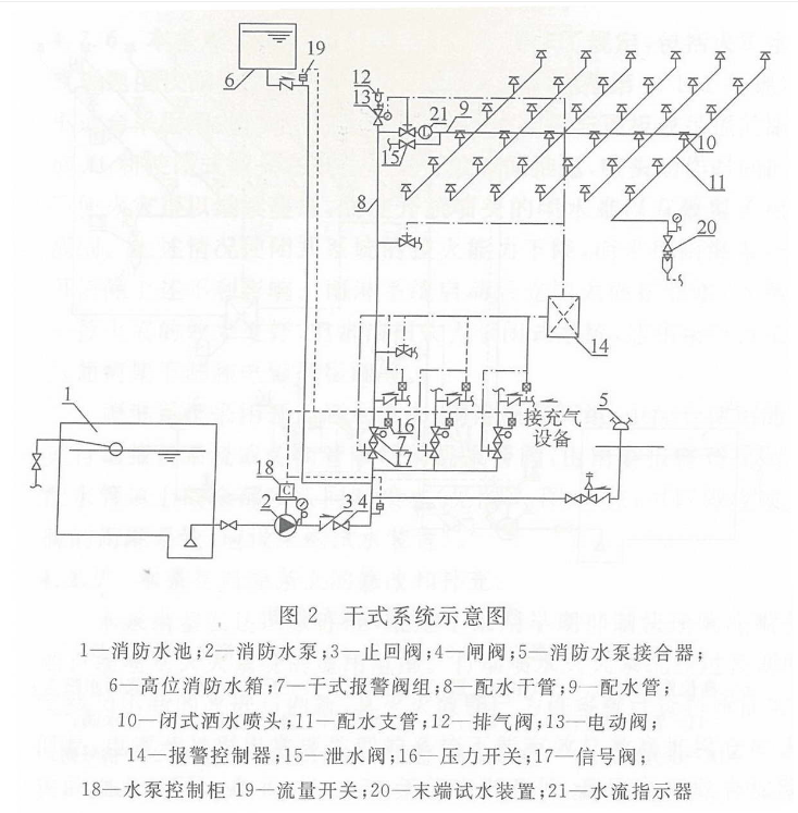 干式系统由闭式洒水喷头、管道、充气设备、干式报警阀、报警装置和供水设施等组成(图2),在准工作状态时,干式报警阀前(水源侧)的管道内充以压力水,干式报警阀后(系统侧)的管道内充以有压气体,报警阀处于关闭状态。发生火灾时,闭式喷头受热动作,喷头开启,管道中的有压气体从喷头喷出,干式报警阀系统侧压力下降,造成干式报警阀水源侧压力大于系统侧压力,干式报警阀被自动打开,压力水进入供水管道,将剩余压缩空气从系统立管顶端或横干管最高处的排气阀或已打开的喷头处喷出,然后喷水灭火。在干式报警阀被打开的同时,通向水力警铃和压力开关的通道也被打开,水流冲击水力警铃和压力开关,压力开关直接自动启动系统消防水泵供水。
