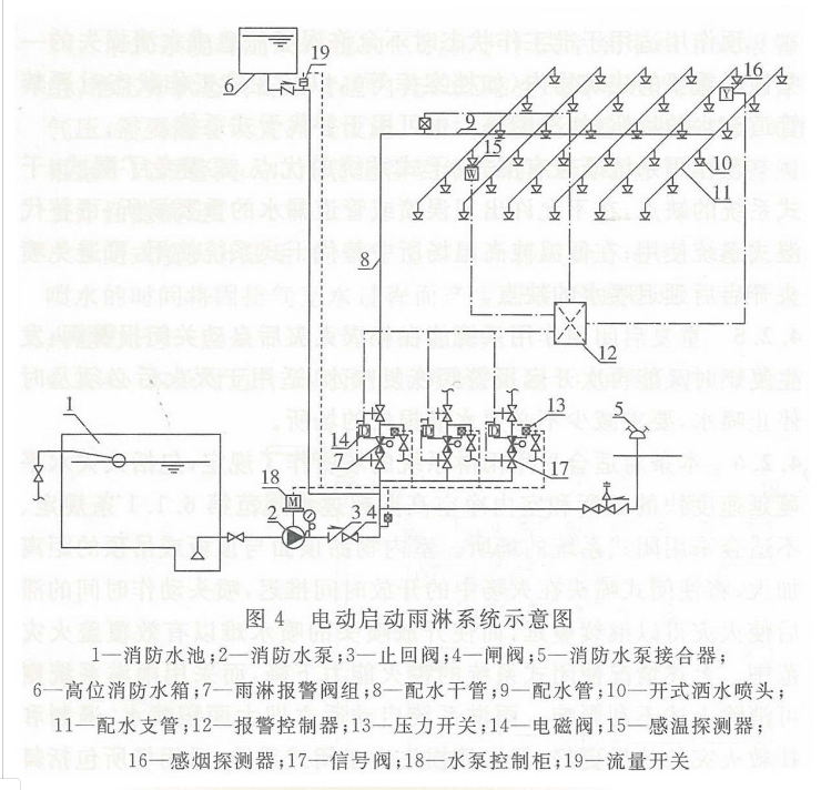 与其他自动喷水灭火系统相比,结构相对简单,系统平时由消防水箱、稳压泵或气压给水设备等稳压设施维持管道内水的压力。发生火灾时,由闭式喷头探测火灾,水流指示器报告起火区域,消防水箱出水管上的流量开关、消防水泵出水管上的压力开关或报警阀组的压力开关输出启动消防水泵信号,完成系统的启动。系统启动后,由消防水泵向开放的喷头供水,开放的喷头将供水按不低于设计规定的喷水强度均匀喷洒,实施灭火。为了保证扑救初期火灾的效果,喷头开放后,要求在持续喷水时间内连续喷水。