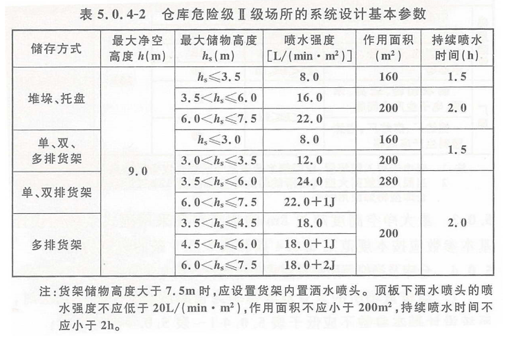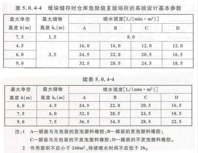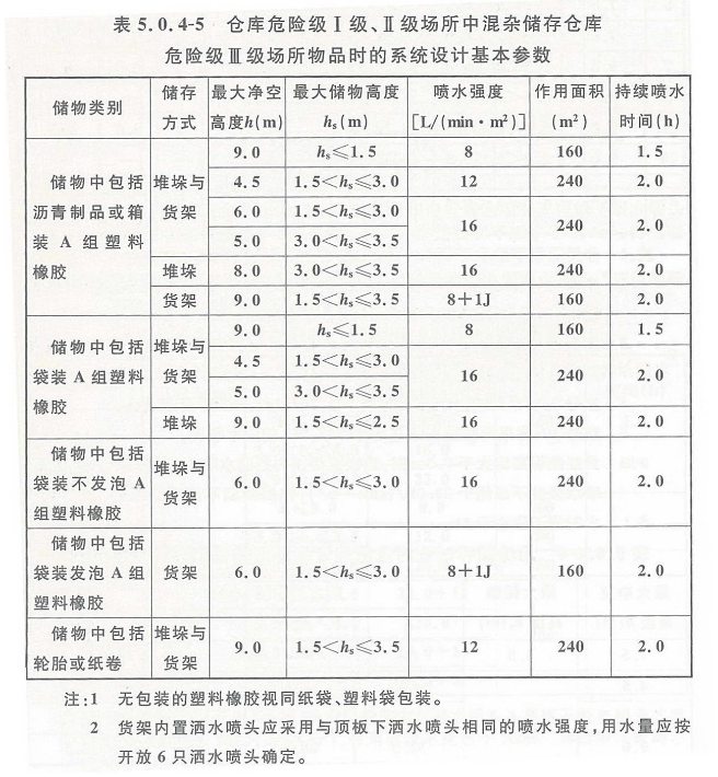 、仓库危险级Ⅱ级场所中混杂储存仓库危险级Ⅲ级物品时,系统设计基本参数不应低于表5.0.4-5的规定。