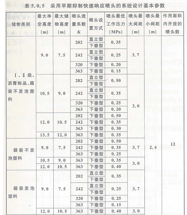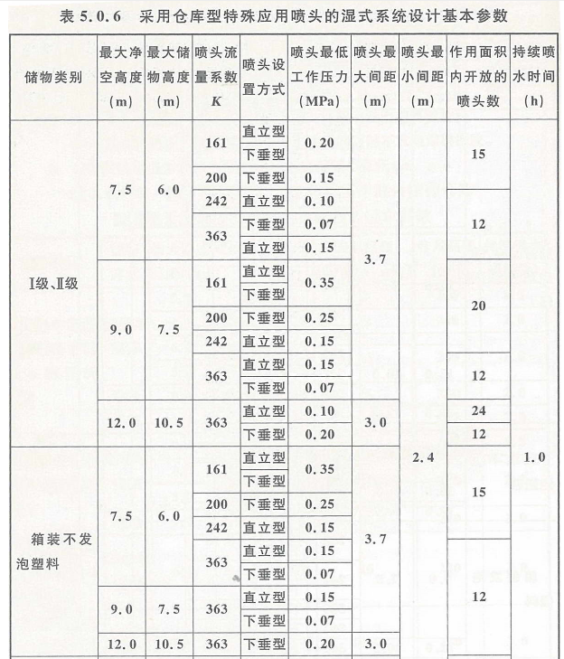 仓库及类似场所采用早期抑制快速响应喷头时,系统的设计基本参数不应低于表5.0.5的规定。