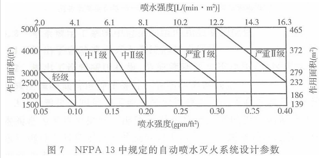 本条依据国外标准并结合我国试验情况确定,图7为美国消防协会标准《自动喷水灭火系统安装标准》NFPA 13中规定的自动喷水灭火系统设计数据,根据NFPA