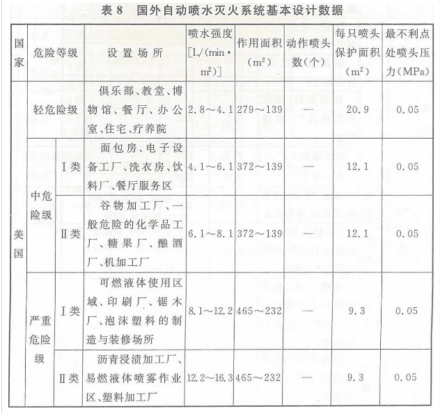 13的规定,每个火灾危险等级对应的曲线上的任一点均是可取的,通常情况下,为求得经济效果,多选择喷水强度大而作用面积小的一点,这也符合“大强度喷水有利于迅速控灭火和有利于缩小喷水作用面积”的试验与经验的总结,本条在制定时选取该曲线中喷水强度的上限数据,并适当加大作用面积后确定为本规范的设计基本参数。这样的技术处理,既便于设计人员操作,又提高了规范的应变能力和系统的经济性能,同时又能保证系统可靠地发挥作用。表8为英国、美国、德国和日本等国的设计基本数据。