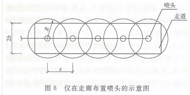 当走道的宽度为1.4m、长度为15m,喷水覆盖全部走道面积时的喷头布置及开放喷头数设置见图8。图中R为喷头有效保护半径。