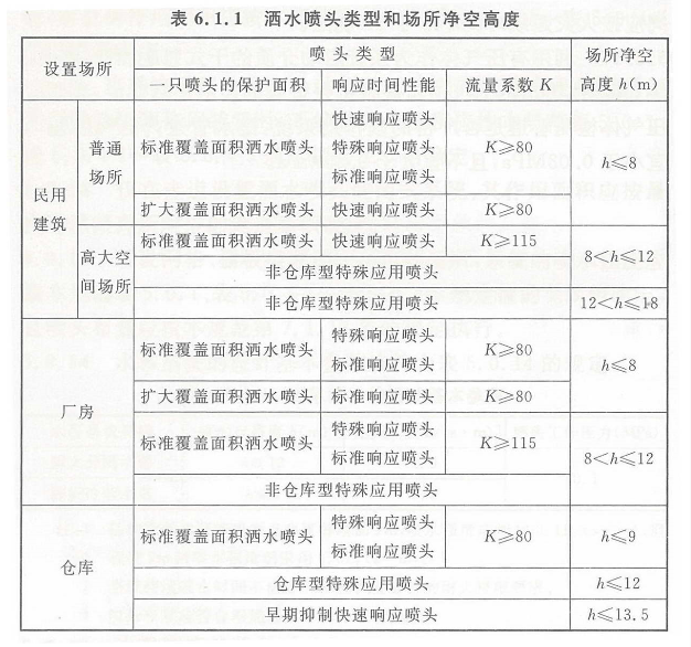 设置闭式系统的场所,洒水喷头类型和场所的最大净空高度应符合表6.1.1的规定;仅用于保护室内钢屋架等建筑构件的洒水喷头和设置货架内置洒水喷头的场所,可不受此表规定的限制。
