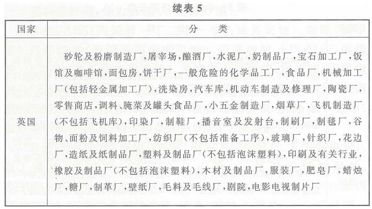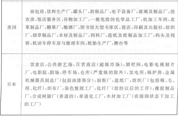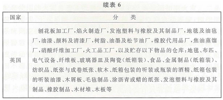 本规范附录A的举例参考了国内外相关规范标准的有关规定。由于建筑物的使用功能、内部容纳物品和空间条件千差万别,不可能全部列举,设计时可根据设置场所的具体情况类比判断。现将美、英、日、德等国规范的火灾危险等级分类列出(见表4、表5、表6),供相关人员参考。