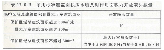 采用标准覆盖面积洒水喷头的系统,喷头布置应符合轻危险级或中危险级Ⅰ级场所的有关规定,作用面积内开放的喷头数量应符合表12.0.3的规定。