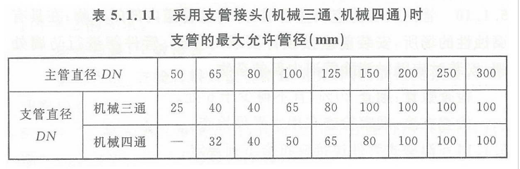 5 机械三通连接时,应检查机械三通与孔洞的间隙,各部位应均匀,然后再紧固到位;机械三通开孔间距不应小于500mm,机械四通开孔间距不应小于1000mm;机械三通、机械四通连接时支管的口径应满足表5.1.11的规定。