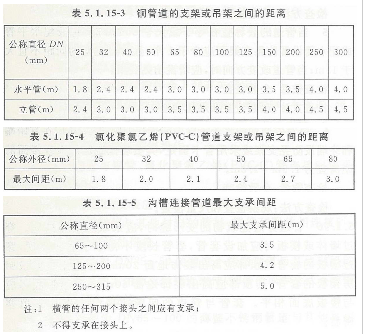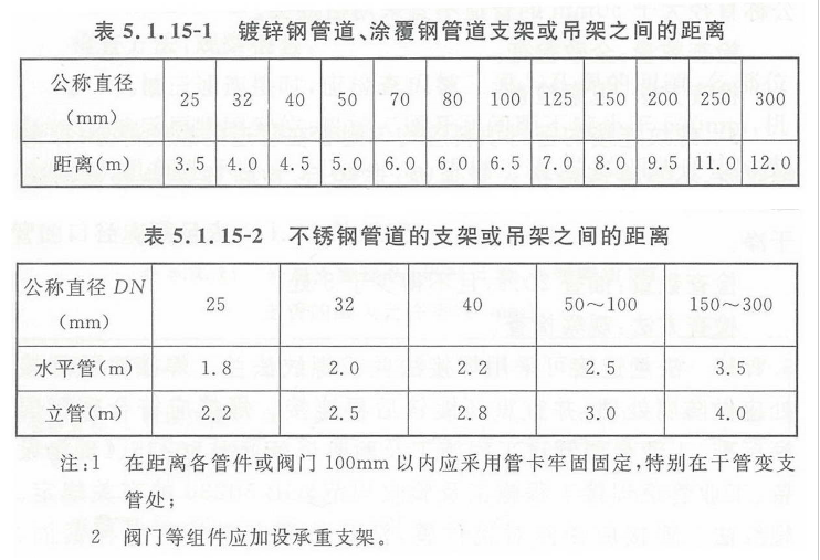 1 管道应固定牢固;管道支架或吊架之间的距离不应大于表5.1.15-1~表5.1.15-5的规定。