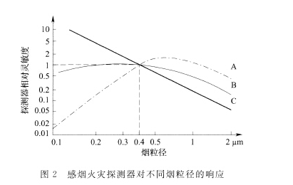 的粒子的响应较差。高海拔地区由于空气稀薄,烟粒子也稀薄,因此光电感烟探测器就不容易响应,而离子感烟探测器电离出来的离子本身就会由于空气稀薄而减少,所以其探测灵敏度不会受影响,因此高海拔地区宜选择离子感烟火灾探测器。三种感烟火灾探测器对不同烟粒径的响应特性如图