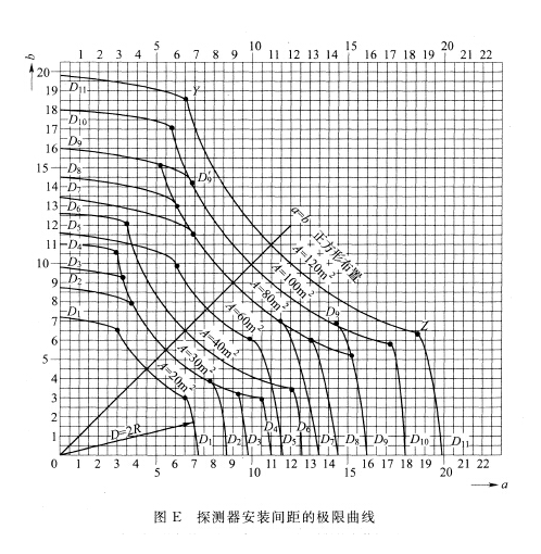 D1~D11(含 D9′)——在不同保护面积 A 和保护半径下确定探测器安装间距 a、b 的极限曲线;