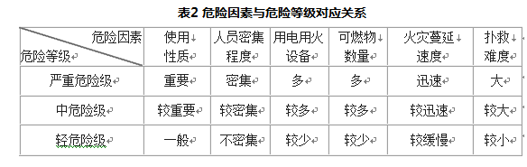 民用建筑大体上可分为公共建筑和居住建筑两大类,在划分危险等级的问题上要比工业建筑复杂,但主要应依据灭火器配置场所的使用性质、人员密集程度、用火用电多少、可燃物数量、火灾蔓延速度、扑救难易程度等因素来划分危险等级。 从使用性质来看:凡使用性质重要,设备与物资贵重的场所,一旦失火社会影响重大,损失严重者系消防重点保护对象,应列入严重危险级;根据2001年11月发布的第61号公安部令第13条及其条文说明,本规范附录D将公安部61号令中界定标准清晰的若干消防安全重点单位的相关场所纳入严重危险级。 从人员密集程度来看:凡人群密集、来往客流众多,且人群有可能聚集、停留一段较长时间的建筑场所,诸如大型商场、超市、网吧、寺庙大殿,以及影剧院、体育馆等歌舞娱乐放映游艺场所,一旦发生火灾,就有可能造成群死群伤的场所,其危险性很大,则应列入严重危险级; 从可燃物数量和用火用电多少来看:凡可燃物数量多、可燃装修多、功能复杂、用火用电多等火险隐患大的场所也应列入严重危险级。 从火灾蔓延速度来看:起火后会迅速蔓延的民用建筑场所,一方面容易引起大火;另一方面,由于火灾蔓延迅速,也会加剧现场人员的恐慌,影响逃生和救援,将会增加人员的伤亡和财产损失,因此应列入严重危险级。 从扑救难度来看:建筑结构和功能复杂的场所,其竖向管井多、隐蔽空间多、火灾蔓延途径也多,起火后扑救难度大;有大量的有毒烟气产生的场所或人群密集的场所,尤其是在地下建筑场所起火时,由于火场混乱,外援困难,也往往会增大扑救火灾的难度;因此应将上述场所划为严重危险级。 同理,按照上述各因素的表现程度的依次降低,可分别定为中危险级和轻危险级场所。 上述因素与危险等级的具体对应关系如表2所示。
