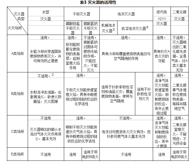 从表3“灭火器的适用性”中可以看出:磷酸铵盐干粉灭火器适用于扑灭A、B、C和E多类火灾。