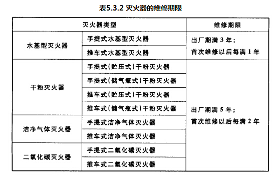 5.3.2 本条对灭火器的维修期限做出了详细规定。只要达到或超过维修期限,即使灭火器未曾使用过,也应送修。本条还规定了首次维修之后的灭火器维修期限间隔。