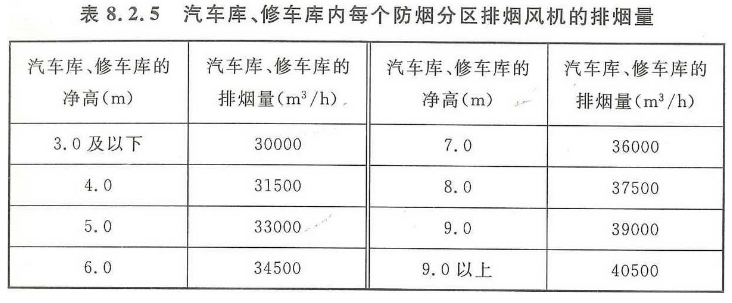 汽车库、修车库内每个防烟分区排烟风机的排烟量不应小于表8.2.5的规定。