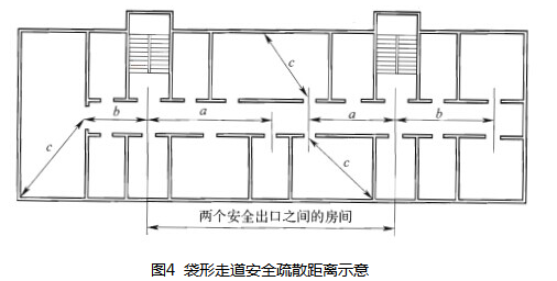 袋形走道两侧或尽端房间的最大距离定为上述距离的一半,因为疏散方向只有一个,走错了方向,还要返回。袋形走道安全疏散距离示意图见图4。