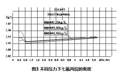 七氟丙烷管流阻力损失的计算,现今的《气体灭火系统—物理性能和系统设计》ISO14520及《洁净灭火剂灭火系统设计规范》NFPA2001都未提供出来。为了建立这一计算方法,首先应该了解七氟丙烷在灭火系统中的管流状态。为此进行了专项实验,对七氟丙烷在20℃条件下,以不同充装率,测得它们在不同压力下七氟丙烷的密度变化,绘成曲线如图3。