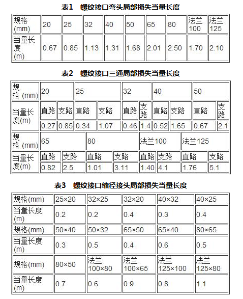 有关管件的局部阻力损失当量长度见表1~表3,可供设计参考使用: