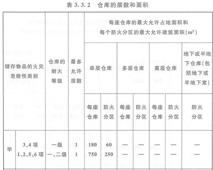 除本规范另有规定外,仓库的层数和面积应符合表3.3.2的规定。