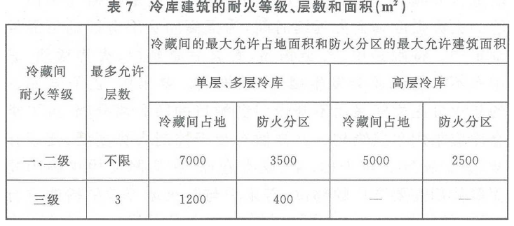 注:1 当设置地下室时,只允许设置一层地下室,且地下冷藏间占地面积不应大于地上冷藏间的最大允许占地面积,防火分区不应大于1500m²;