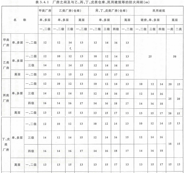 除本规范另有规定外,厂房之间及与乙、丙、丁、戊类仓库、民用建筑等的防火间距不应小于表3.4.1的规定,与甲类仓库的防火间距应符合本规范第3.5.1条的规定。