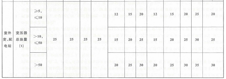 在本规范第3.4.1条表3.4.1中,按变压器总油量将防火间距分为三档。每台额定容量为5MV·A的35kV铝线电力变压器,存油量为2.52t,2台的总油量为5.04t;每台额定容量为10MV·A时,油量为4.3t,2台的总油量为8.6t。每台额定容量为10MV·A的110kV双卷铝线电力变压器,存油量为5.05t,两台的总油量为10.1t。表中第一档总油量定为5t~10t,基本相当于设置2台5MV·A~10MV·A变压器的规模。但由于变压器的电压、制造厂家、外形尺寸的不同,同样容量的变压器,油量也不尽相同,故分档仍以总油量多少来区分。